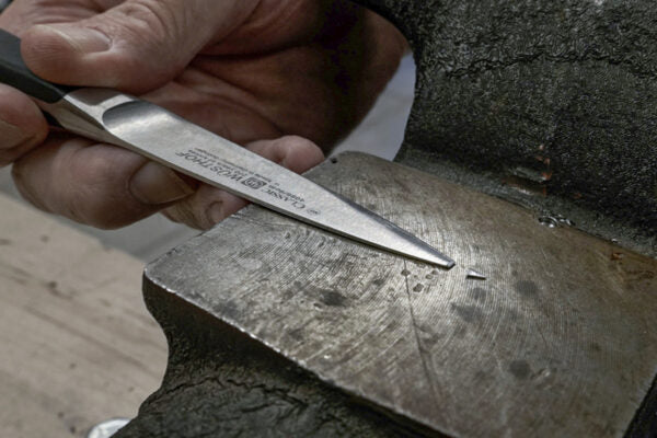 In the video above special guest Steve prepares to repair the tip of a Wusthof pairing knife on the Work Sharp Ken Onion Sharpener with Blade Grinding Attachment – a tool he designed over the course of his 22 year (and counting) tenure with Work Sharp. First… we had to break the tip in order to repair it.