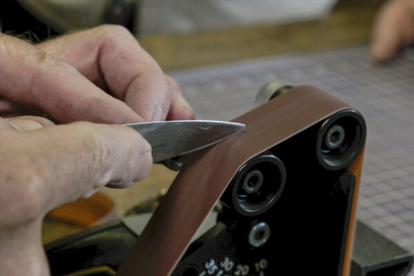 - Rest the spine of the knife on the horizontal platform, maintaining this angle, bring the knife up to contact the belt between the pulleys and draw the bevel across the belt.