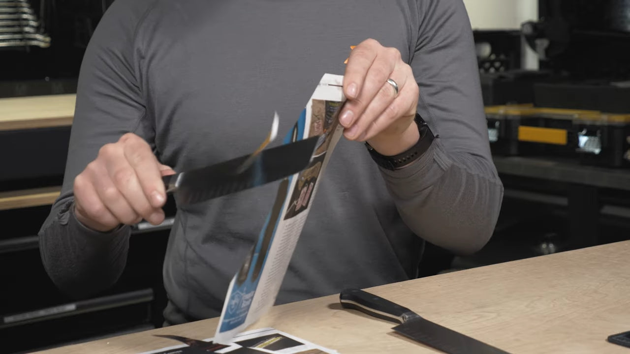To evaluate the knives' cutting performance, Josh and Kyle exchange knives and perform a few cuts on paper. Both knives effortlessly slice through, showcasing their sharpness. However, subtle differences can be felt. The knife sharpened on the Pro PA exhibits a smoother cutting action, while the one from the original Precision Adjust has a slight "teethy" feel. This distinction in cutting sound is evident and contributes to the overall experience.