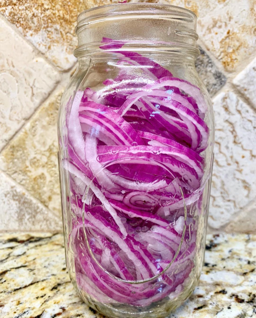 Thinly slice 2 medium red onions and place in a jar. In a separate bowl, mix 1 cup apple cider vinegar, 1 cup hot water, 1.5 tbsp sugar, and 2 tsp salt. Mix well until sugar and salt has dissolved. Pour the liquid over the red onions in the jar. Refrigerate overnight.