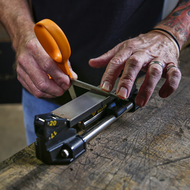 Here is a step-by-step guide on how to sharpen your scissors using one of our Work Sharp manual or electric sharpeners. Note that while some Work Sharp sharpeners do not include a scissor angle guide, any abrasive is able to sharpen the blades on your scissors.