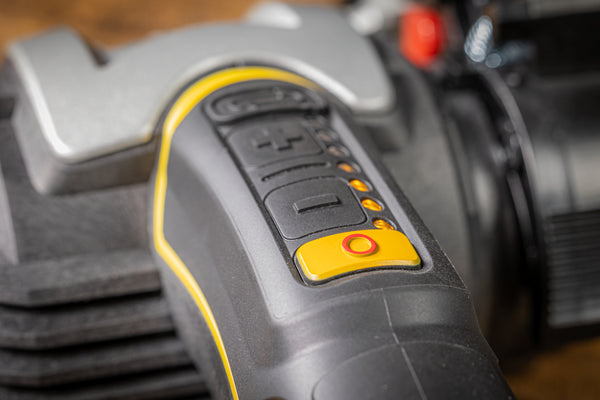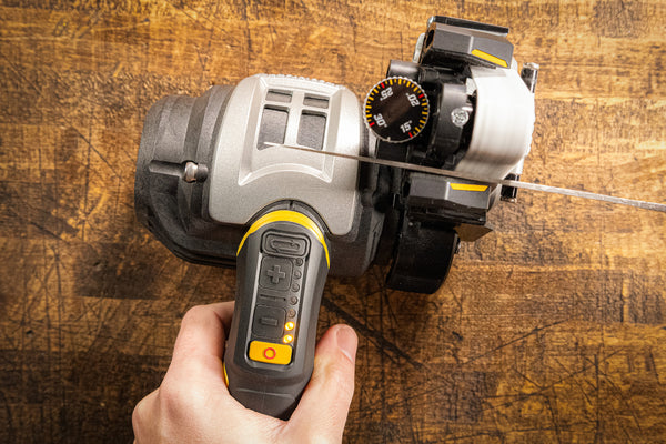 The industry first digital speed control buttons give you complete and repeatable control over the speed and continuous use of the sharpener. Simply increase or decrease the motor speed with the press of a button. Low speeds for honing, high speeds for grinding. The upper “Continuous Run” use button lets you keep the sharpener running hands free, and the lower amber kill switch lets you quickly cut power without needing to reach around to the trigger below.
