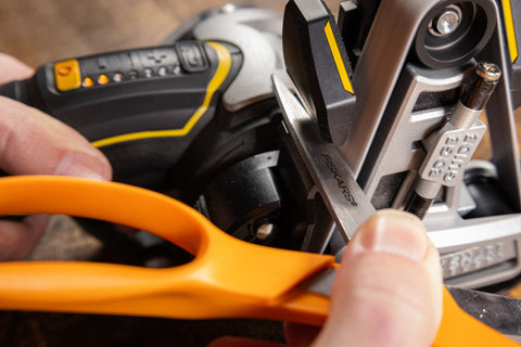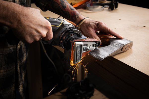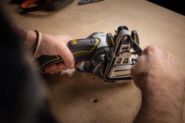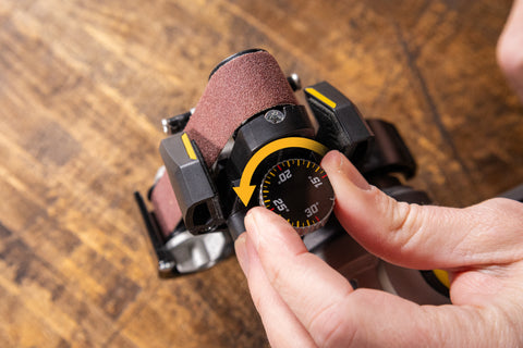 Axes and lawn mower blades come in a wide range of shapes and sizes so we tackle these with Sharpening Method 2. Pulling up on the back of the cassette to remove the angle guides then rotating the cassette forward exposes a full side of the belt at 45°. This angle combined with our Flexible Belt Technology will allow convex sharpening along even the oddest of shapes and edges. Load up the coarse 120 belt, bump the speed to 7, and you have yourself a handheld power grinder for quickly shaping metal and refining edges.